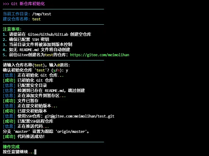 适用于多 Linux 发行版、彩色美化输出、Git 仓库初始化工具,支持传参或交互式输入仓库地址,自动转换 HTTPS 为 SSH 地址、初始化仓库、提交并推送代码。