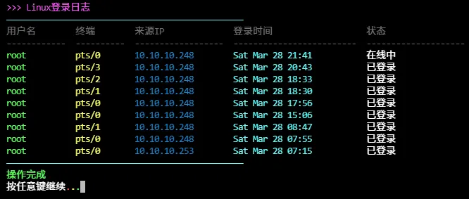 echo -e "${gl_zi}>>> Linux登录日志${gl_bai}"