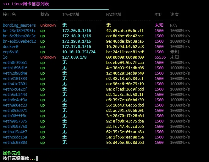 echo -e "${gl_zi}>>> Linux网卡信息列表${gl_bai}"